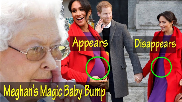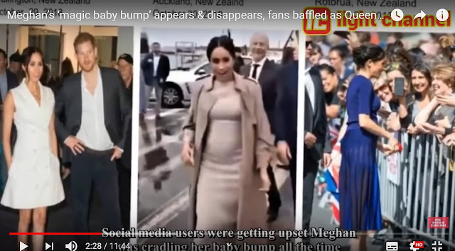 (Omlouvám se za kvalitu fotek níže, jsou to prinstcreeny z videí, nechtělo se mi to až tolik hledat. Ale na videích uvidíte nesrovnalosti ve velikosti břicha zcela zřetelně)(Videa například Meghan Markle Faked Her Pregnancy;   Meghan´s Magic Bump Appears and DisappearsRoyal „Birth“ Has Been One Of The Biggest Scams Of This Century).