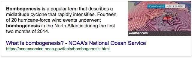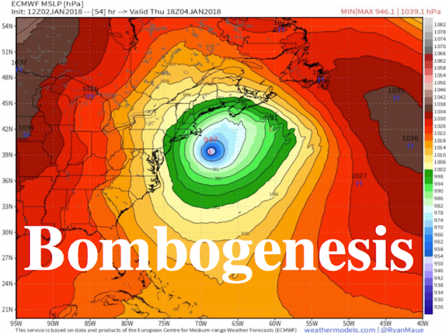 Wikipedie přidala (=geoinženýři do ní přidali) právě teď, s datem 12. ledna 2018, fungl nové heslo k těmto novým termínům (i předešlým), vysvětlující, že se jedná o jev, při němž klesne náhle atmosférický tlak o 24mbar za 24 hodin a vznikne mimořádně destruktivní jev. Oficiálně je to samozřejmě připisováno klimatické změně či globálnímu oteplování.