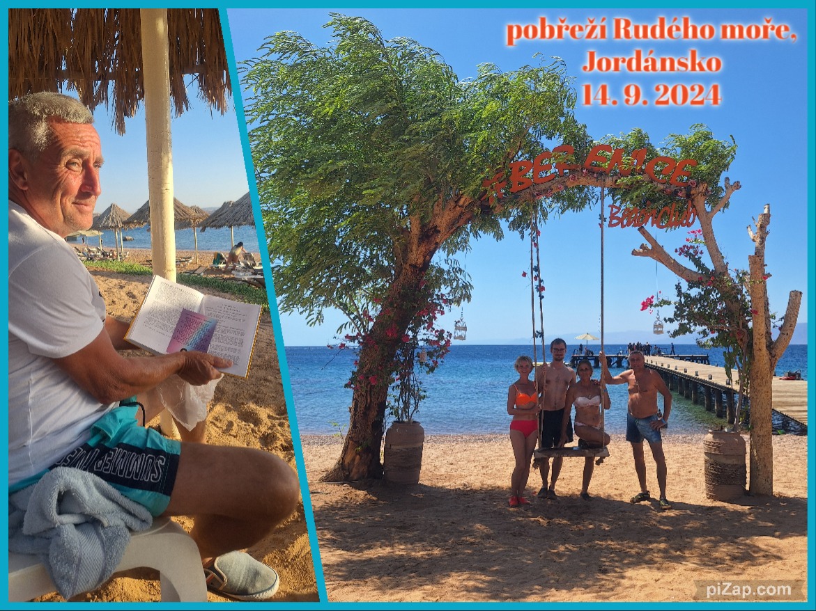 Míša: Když se končil náš pobyt v resortu, Vilko na pláži studoval Nové Zjevení Pána Ježíše Krista, s nímž se později prošel i k plotu akabské mešity, nesoucí název Mešita Šarífa Husajna bin Alího (The Sharif Al Hussein Bin Ali Mosque).